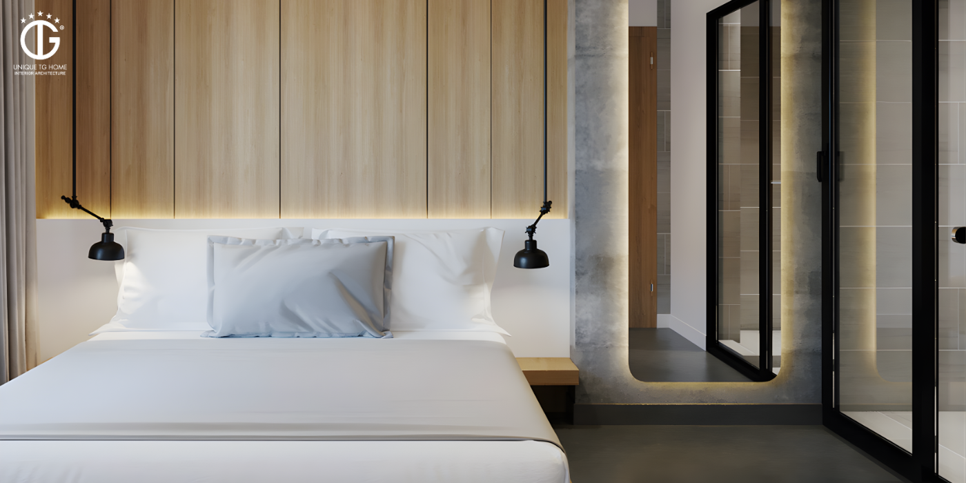 Để căn nội thất căn phòng ngủ không quá đơn điệu, mảng tường màu giả bê tông được sử dụng trang trí phòng ngủ thêm điểm nhất.
