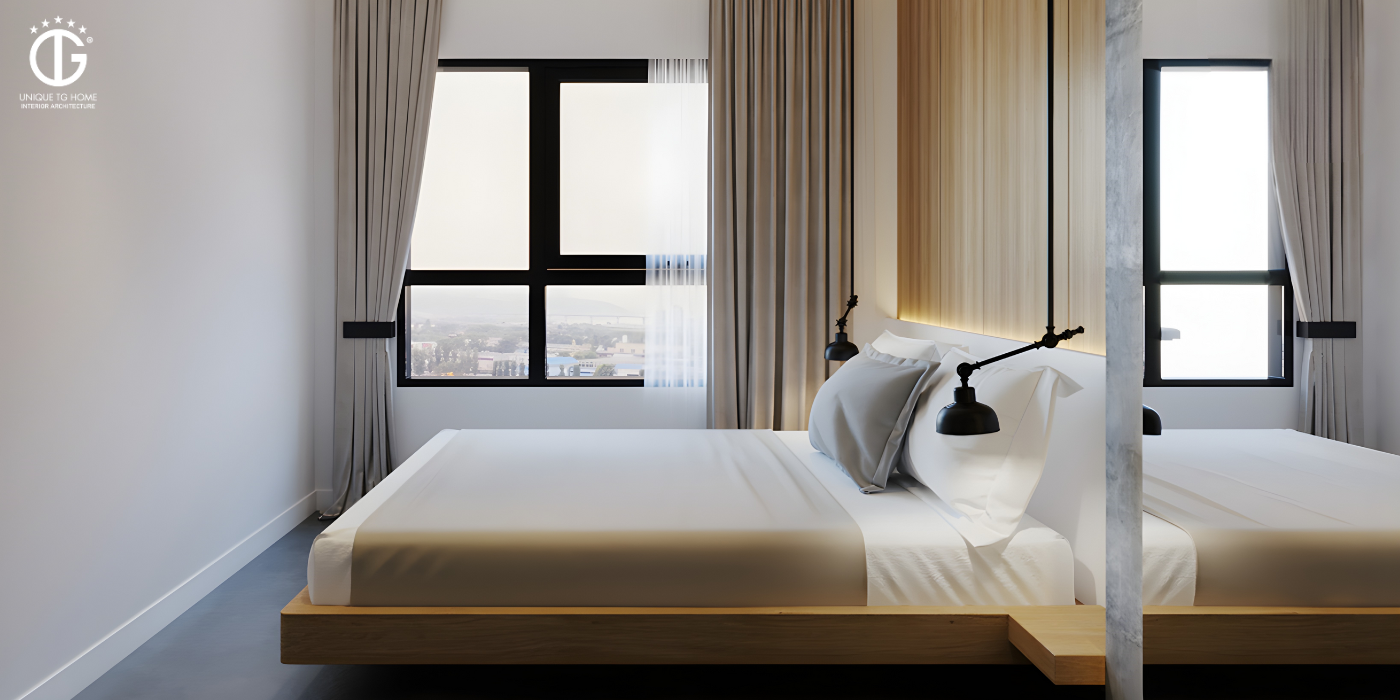 Thiết kế đơn giản nhưng tinh tế trong nội thất từ mảng tường cho đến những chiếc đèn trần cũng giúp cho phòng ngủ thêm phần hiện đại.