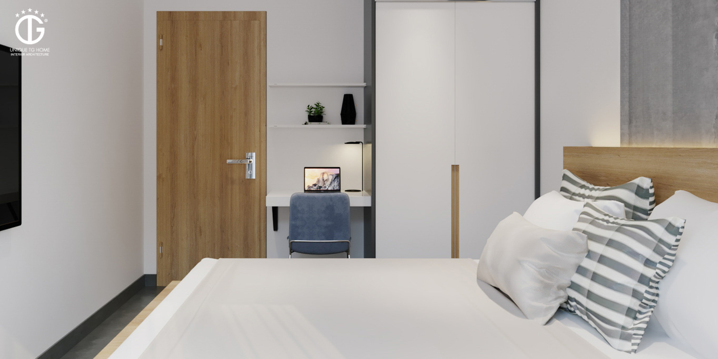 Đúng với phong cách hiện đại, phòng ngủ nhỏ được thiết kế một cách tối giản đi các chi tiết. Nhưng vẫn mang lại những đáp ứng về công năng. Một tủ áo quần bằng gỗ công nghiệp phũ sơn trắng cùng tone với toàn bộ nội thất của chung cư.
